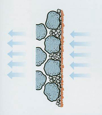 在塑燒濾板的母體基板內(nèi)部,經(jīng)過對(duì)時(shí)間、溫度的控制燒結(jié)后,會(huì)形成均勻孔隙。然后由樹脂填充表面處理,使孔隙達(dá)到均勻的u級(jí)微孔。獨(dú)特的表面處理不僅只限于濾板表面,而是深入到孔隙內(nèi)部。見圖一。