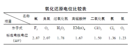 ? ? ? ?臭氧的氧化能力極強,從下表可知,臭氧的氧化還原電位僅次于氟,比過氧化氫、高錳酸鉀等都高。此外,臭氧的反應產(chǎn)物是氧氣,所以它是一種清潔型的強氧化劑。