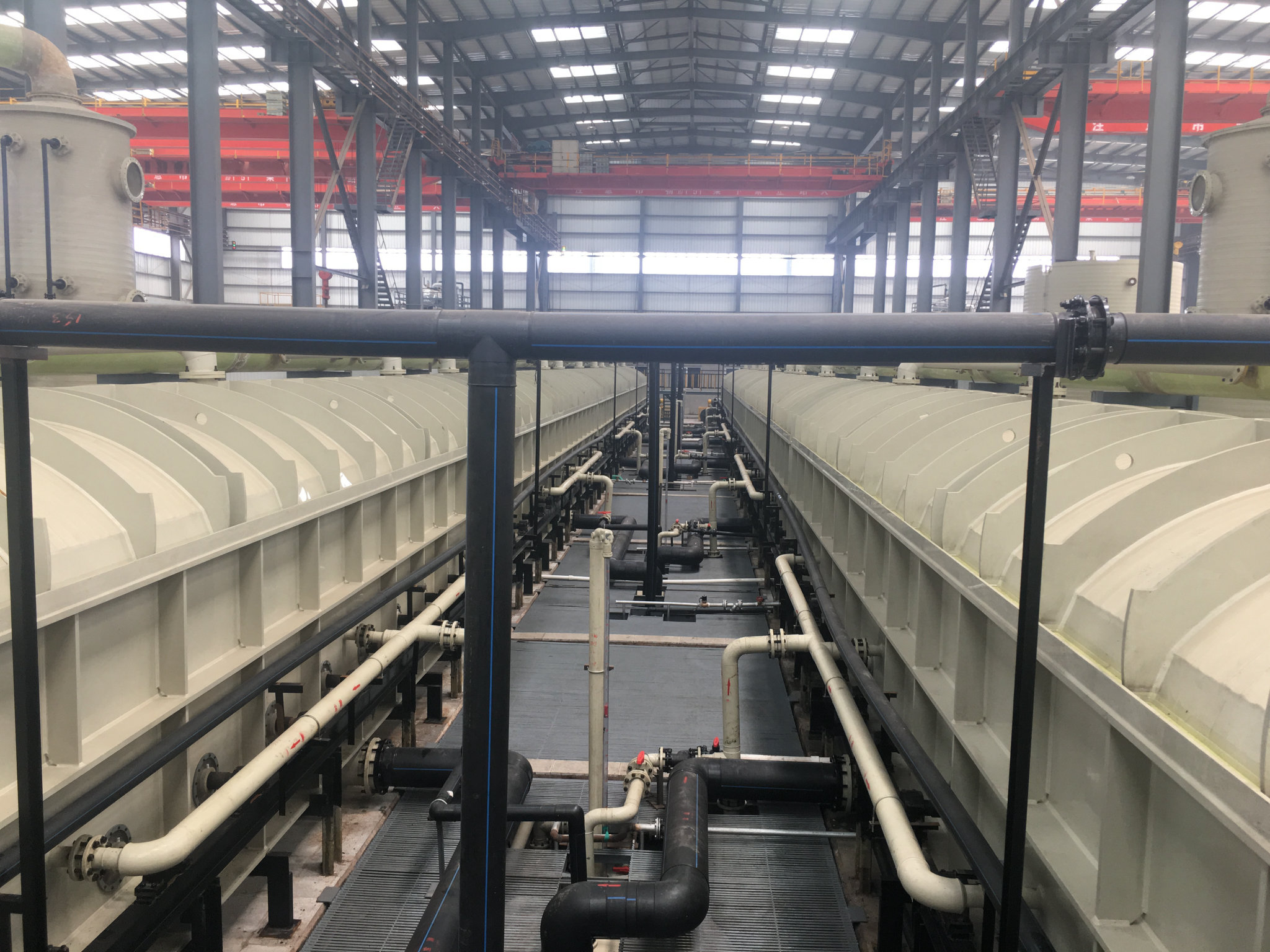 酸洗車間工藝產(chǎn)生的酸霧廢氣在耐腐蝕風(fēng)機(jī)引起的負(fù)壓作用下,經(jīng)收集系統(tǒng)收集后經(jīng)輸送管網(wǎng)接入濕式霧化裝置底部,氣體由下向上,堿性吸收液由循環(huán)裝置通過布液設(shè)備以霧狀或小水滴均勻向下噴淋,氣液兩相在多面球填料形成逆流充分接觸反應(yīng),此填料具有表面積大,空隙率高,傳質(zhì)性能好的優(yōu)異性能,經(jīng)霧化后的吸收液均布在多面球填料上,液氣充分接觸吸收,有效捕捉廢氣中的污染物,從而除去酸霧中的硝酸及鹽酸。除去酸霧后的濕潤氣體經(jīng)除霧干化裝置除去水霧后,經(jīng)排放煙囪直接排放。